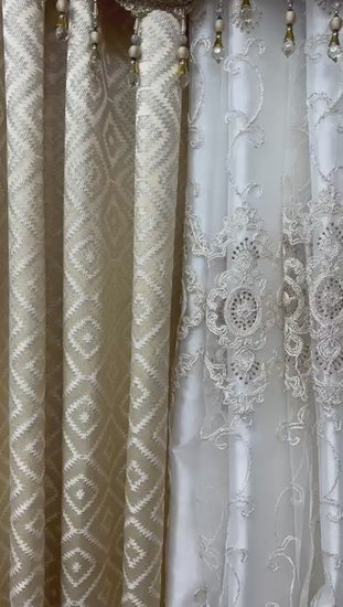 Give your home a grand, luxurious makeover with the Maxine 7-Piece Curtain Set, designed to bring elegance, texture, and timeless beauty to any room. Made from premium jacquard fabric with shimmering designs and crystal-style beads, this set offers a complete window transformation in one purchase.